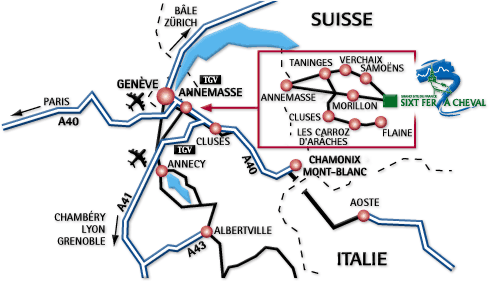 | Taxi transport de 1 à 8 pers ALPS TRANSFERT tel : 06 11 30 30 15 www.alpstransfert.com Route / By the road : Autoroute A40 Genève / Chamonix Sortie : Cluses - Scionzier, Samoëns 20 mn Train : Arrivée gare SNCF à Cluses (22kms). Avion / By plane : Annecy - Meythet Lyon - St Exupéry Genève - Cointrin Distance : Cluses : 22km Annecy : 80 kms Chamonix : 60 kms Genève : 70 kms Lyon : 200 kms Paris : 600 kms | ![]() |